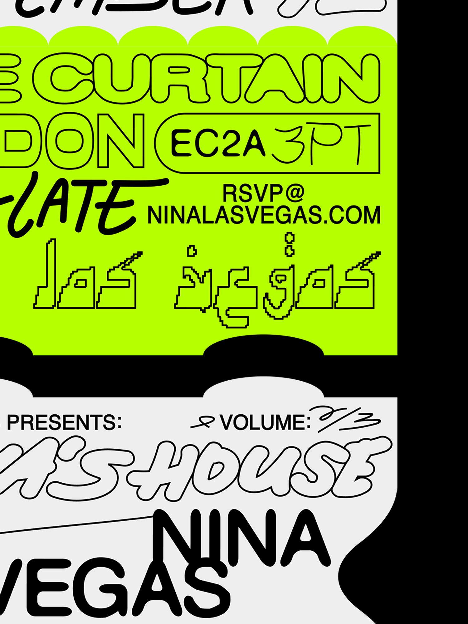 A poster series and visual direction for Nina Las Vegas’s show at the Curtain, in London. I wanted to emphasize the unique quality of Nina’s music with these designs. The neon colors are inspired by the electronic / dance music genre. Posters have ticket inspired elements, from perforated marks to divots to imbue a sense of nightlife. Each poster’s shape is modular; so they can playfully fit and stack. Each poster also abstracts progressively and intensifies in color to emulate the directionality of successive shows.